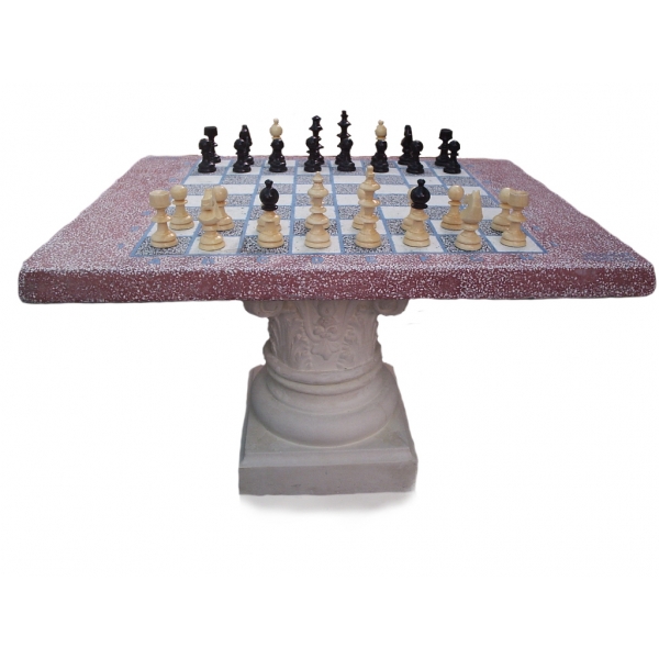 Chess table is made of two pieces, the foot and the board. The foot is made from one piece and is made of white cement and marble dust. Chessboard is made of colored mosaic. All of the mosaic squares are colored black and white (NOT painted). Line of squares and the letters are from a special resin to weathering and UV resistance. The chess table command can be any color the customer wants. Table also includes two chairs made of white cement and marble dust.