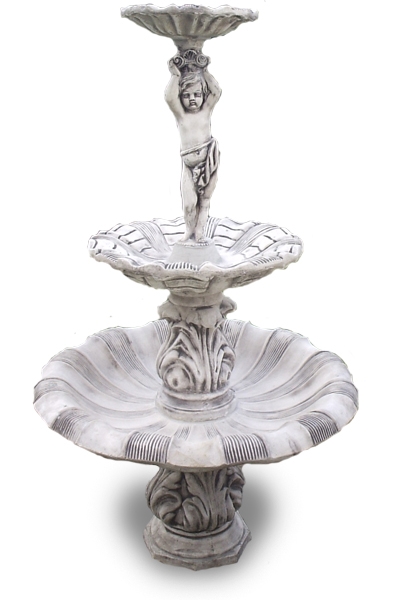 Garden fountains made of white cement and marble dust with an antiqued look.