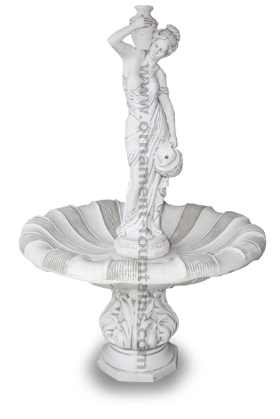 Garden fountains made of white cement and marble dust with an antiqued look.