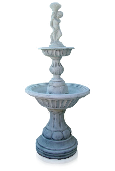 Garden fountains made of white cement and marble dust with an antiqued look.